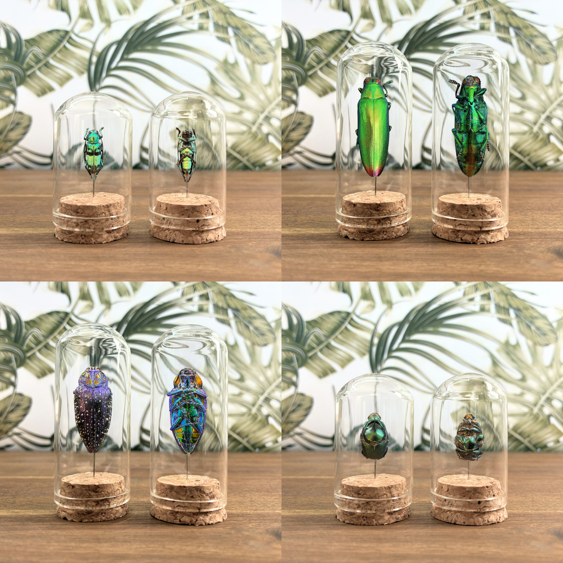 Select from a range of sizes, colours and shapes of small beetles displayed in a uniquely domed jar, perfect for viewing all sides of the beetle. With the cork situated at the bottom of the jar, even the top side of the specimen is visible.