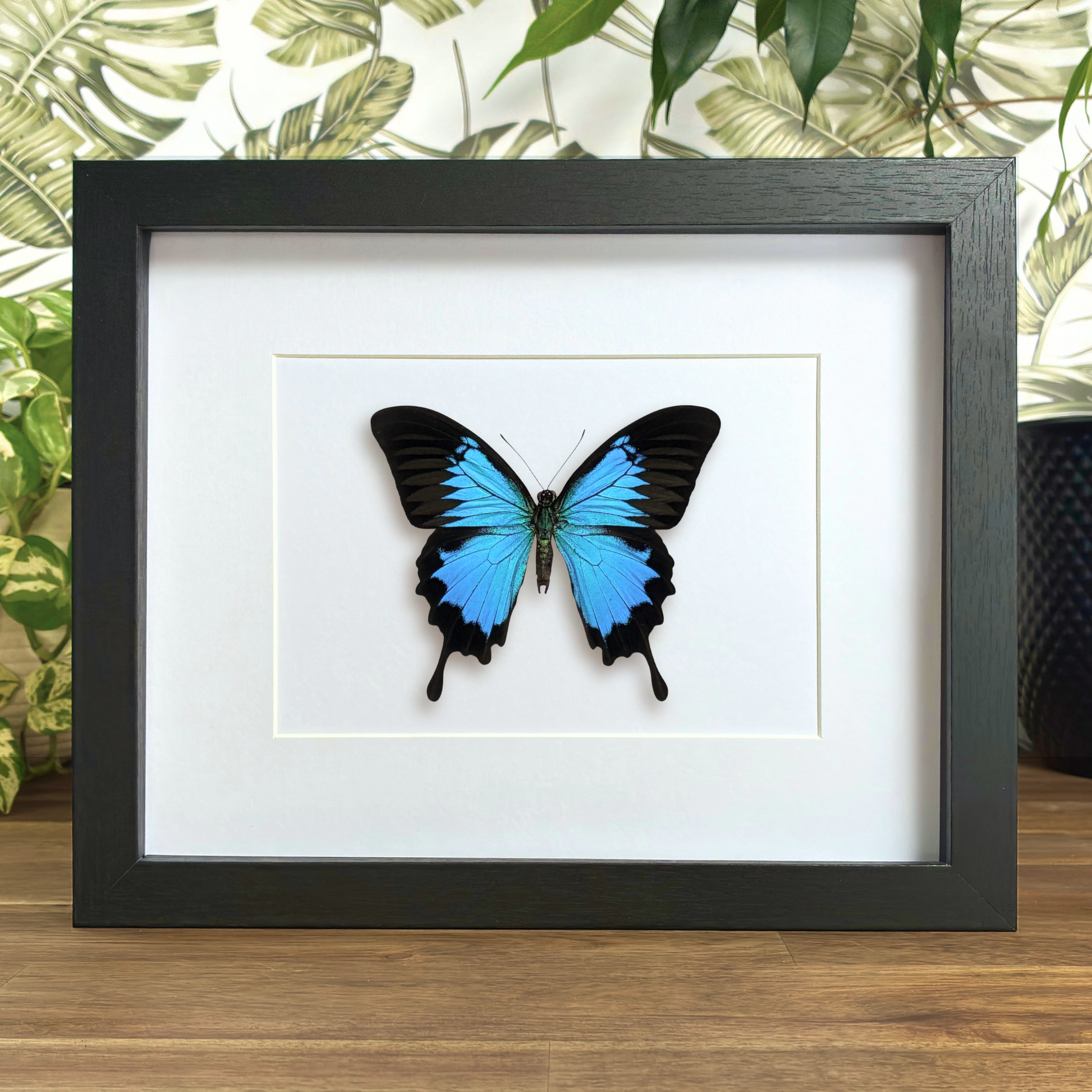 The Ulysses butterfly, also known as the also known as the Blue mountain swallowtail or Blue emperor, has a wingspan of about 12 cm. It's wings are an iridescent electric blue caused by the microscopic structure of it's scales, a phenomenon called structural colouration. This blue colour can range from a bright cyan to a deep indigo.